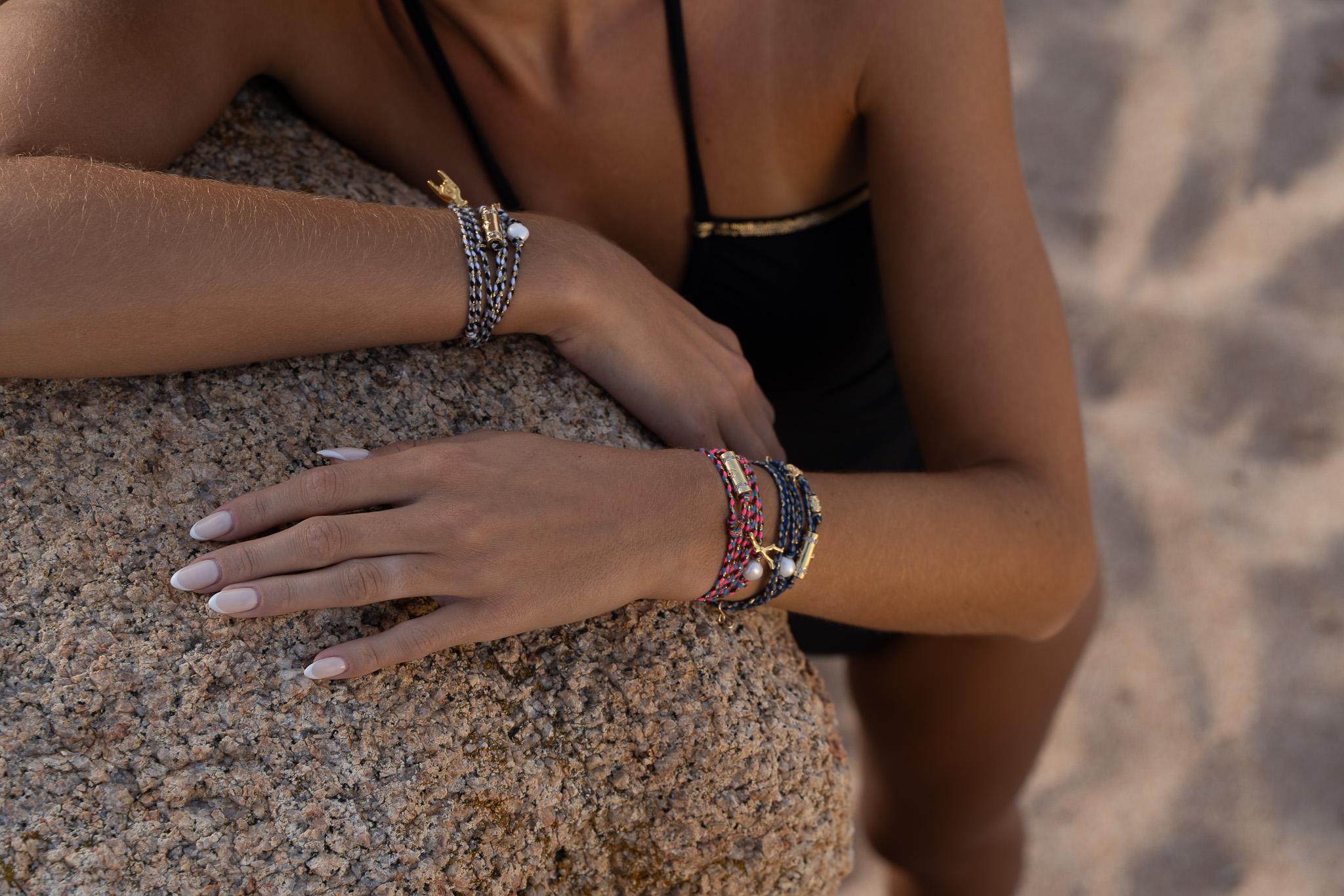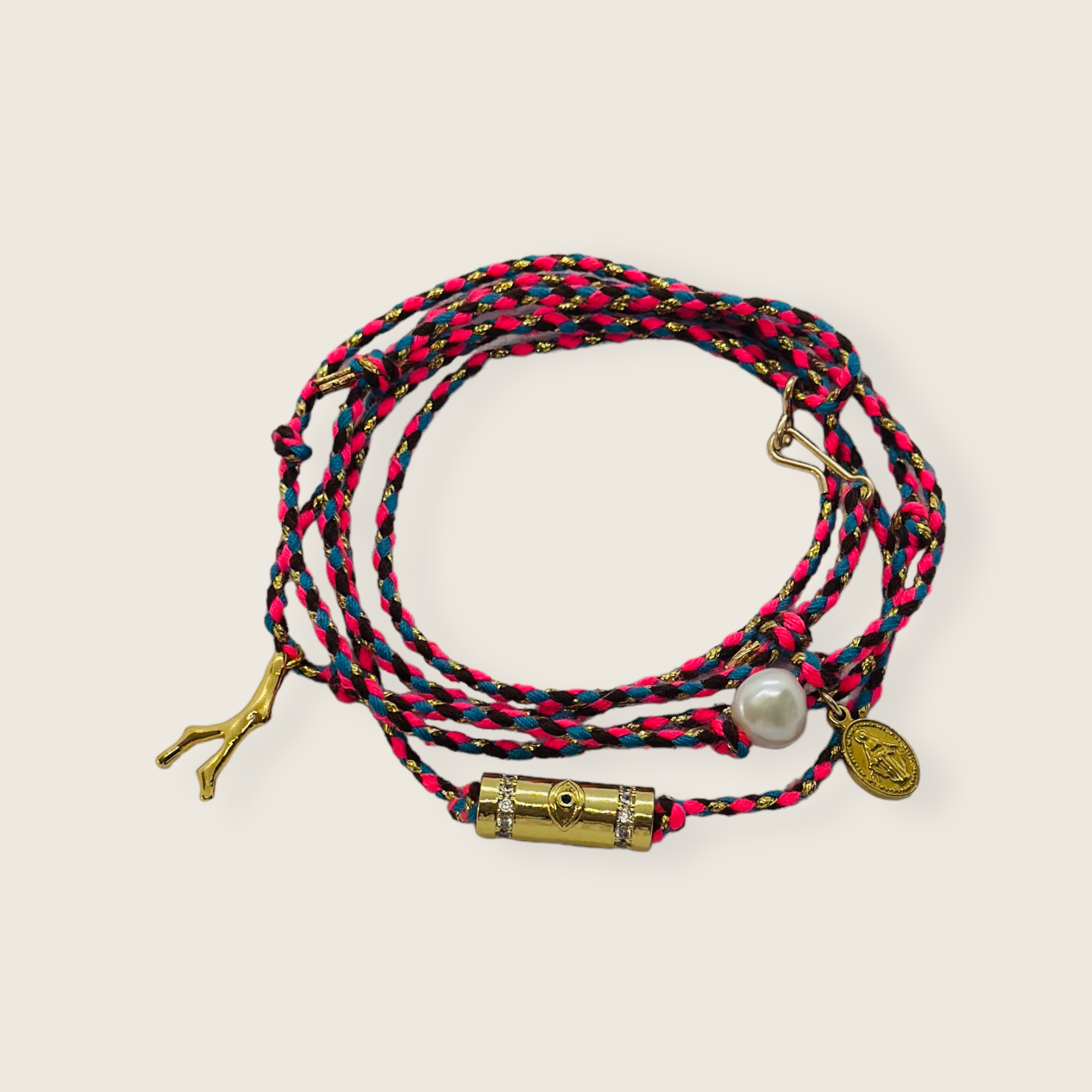 Bracelet de la collection chance de Casalucia, 7 tours en nylon et lurex. Fermoir aimanté et cordon ajustable. Breeloque en acier inoxydable et perle d’eau douce.