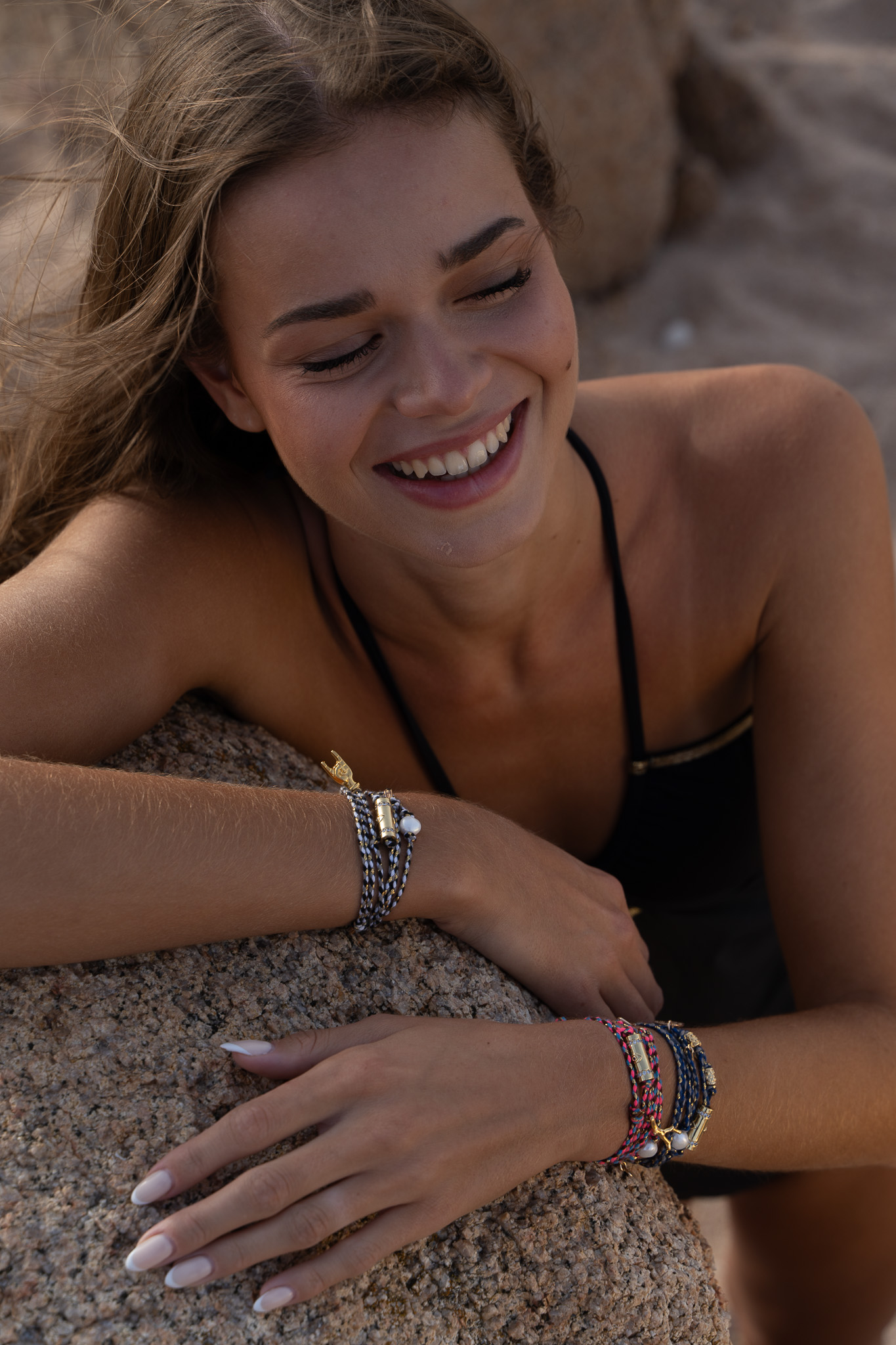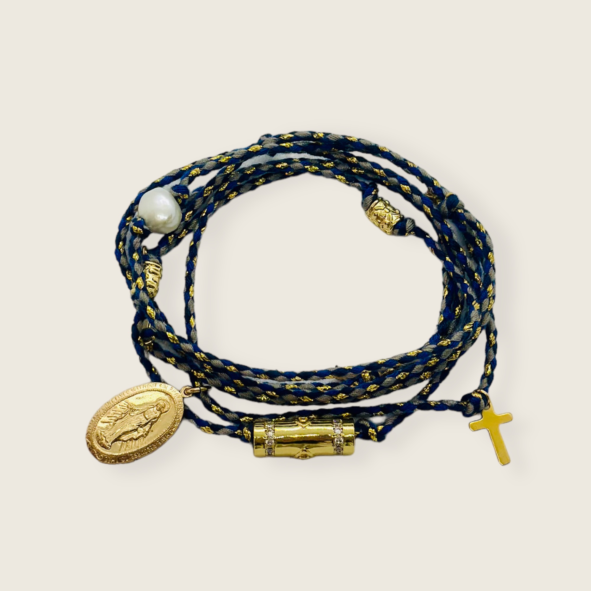 Bracelet 7 tours en nylon et lurex. Fermoir aimanté et cordon ajustable. Breeloque en acier inoxydable et perle d’eau douce.