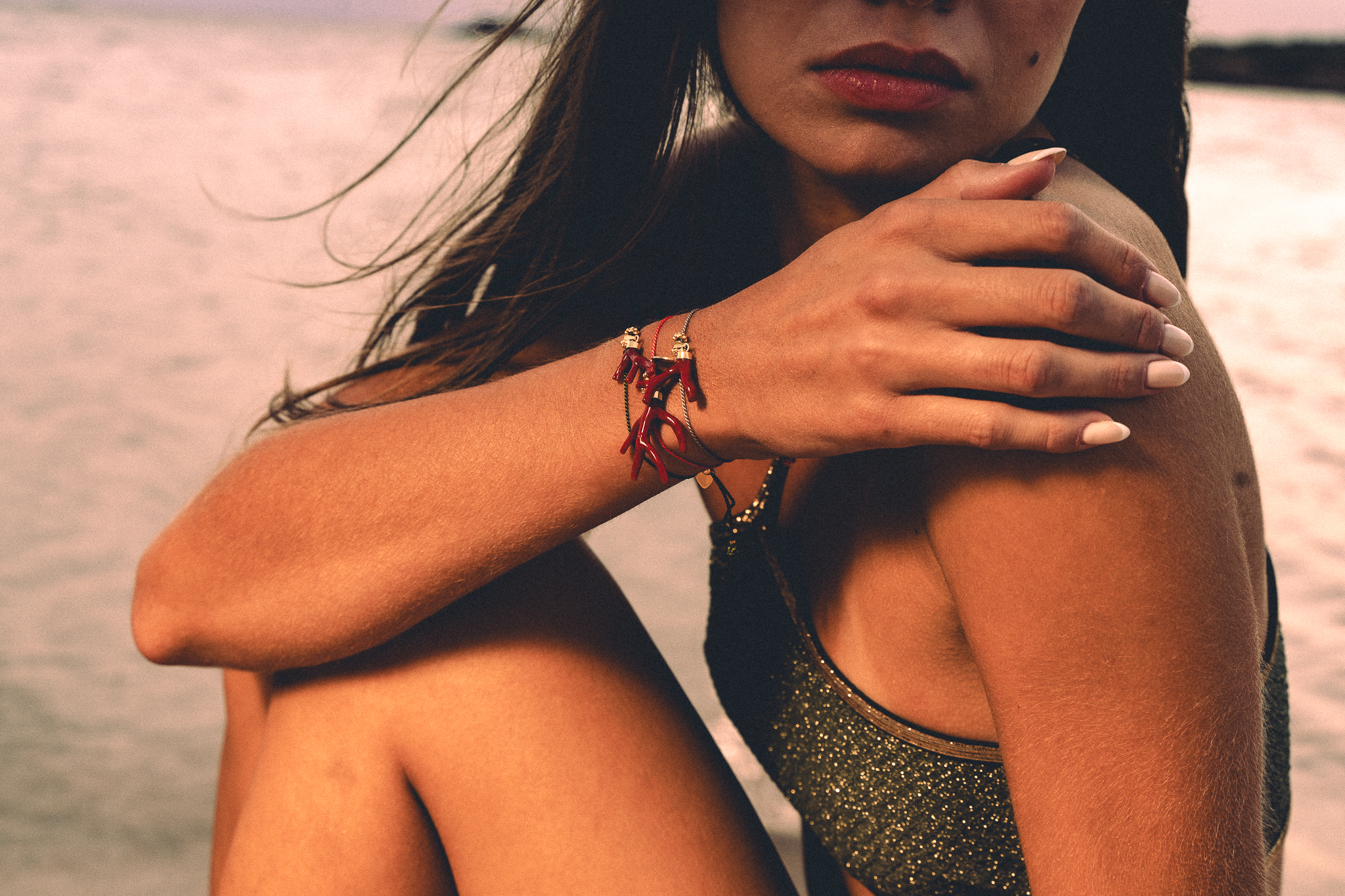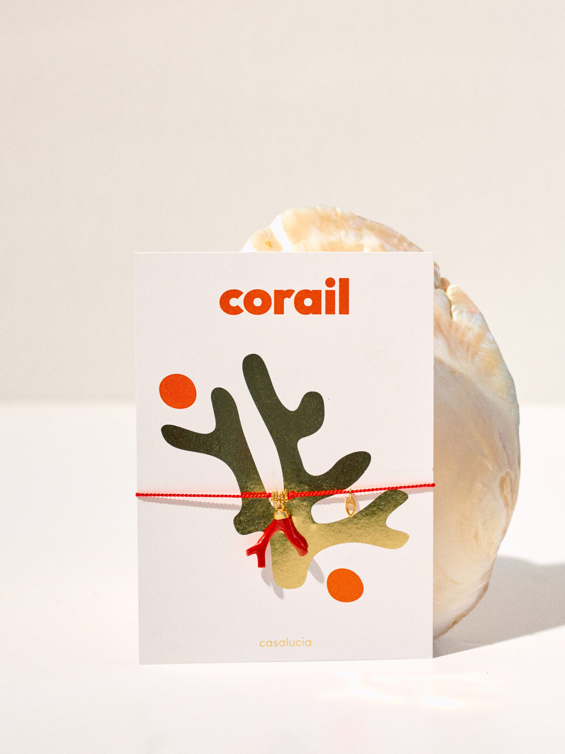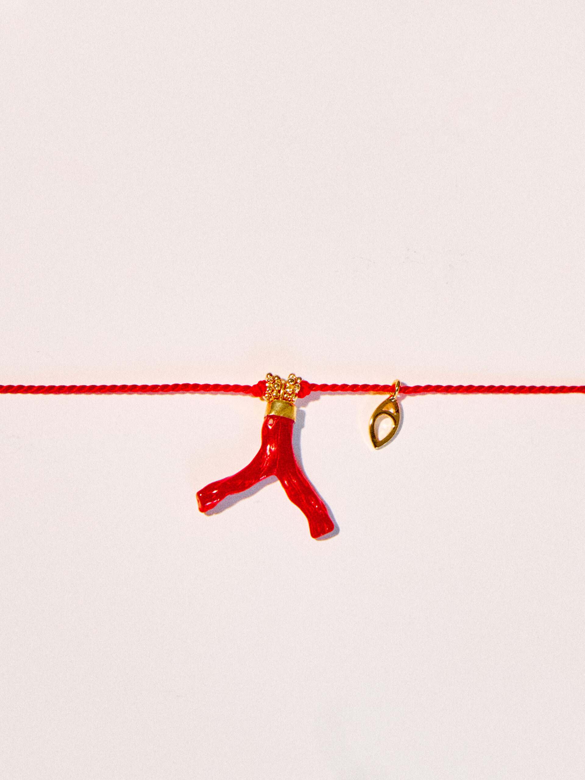 Bracelet  Elbe de chez Casalucia, réalisé en fil de soie, or laminé 14 K et pièce de corail de Méditerranée.