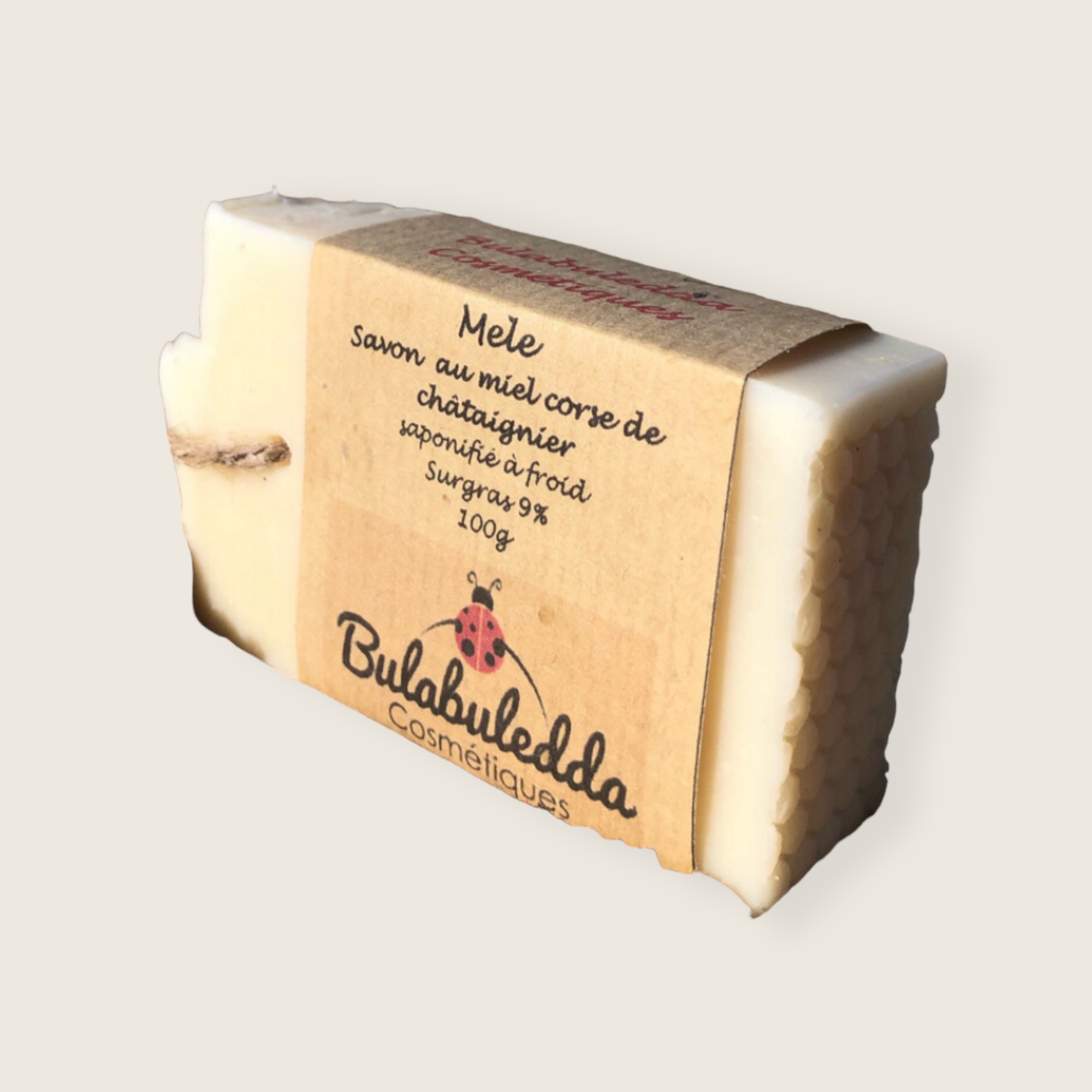 Savon au miel de châtaignier de Corse, saponifié à froid, surgras à 9%. 100g. Pour toute la famille, corps et visage, très doux.